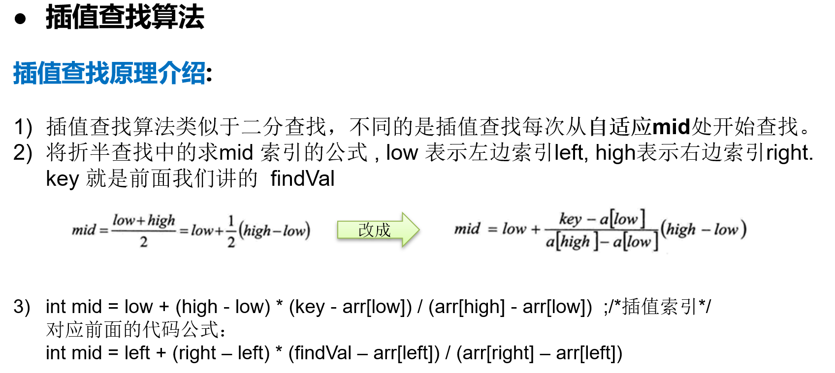4.2 代码实现 1 2 3 4 5 6 7 8 9 10 11 12 13 14 15 16 17 18 19 20 21 22 23 24 25 26 27 28 29 30 31 32 33 34 35 36 37 38 39 40 41 42 43 44 45 46 47 48 package com.atguigu.search;import java.util.Arrays;public class InsertValueSearch { public static void main (String[] args) { int [] arr = new int [100 ]; for (int i = 0 ; i < 100 ; i++) { arr[i] = i + 1 ; } System.out.println(Arrays.toString(arr)); System.out.println("查找的数的下标为:" + insertValueSearch(arr, 0 , arr.length - 1 , 30 )); } public static int insertValueSearch (int [] arr, int left, int right, int findVal) { System.out.println("方法被调用了" ); if (left > right || findVal < arr[0 ] || findVal > arr[arr.length - 1 ]) { return -1 ; } int mid = left + (right - left) * (findVal - arr[left]) / (arr[right] - arr[left]); int midVal = arr[mid]; if (findVal > midVal) { return insertValueSearch(arr, mid + 1 , right, findVal); } else if (findVal < midVal) { return insertValueSearch(arr, left, mid - 1 , findVal); } else { return mid; } } }